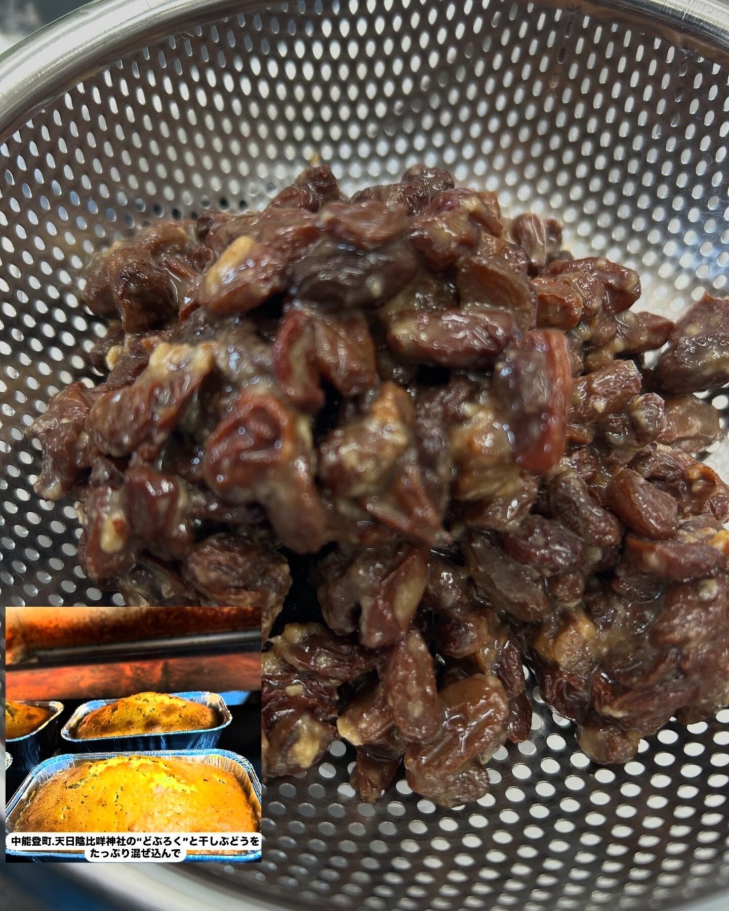 天日陰比咩神社で造られた“どぶろく”に干しブドウを漬け込んで柔らかくなったフルーツをたっぷり混ぜ込んだ風味豊かな『フルーツパウンドケーキ』です。
